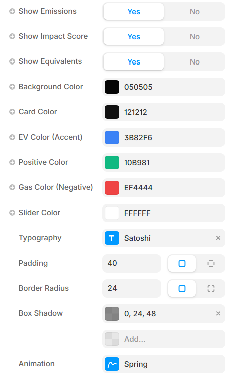 Brand Colors: Adjust the background, card, slider, positive (savings), and negative (gas cost) colors to perfectly match your site's theme.