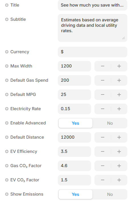 Default Values: Set the baseline currency, gas spend, MPG, and electricity rates to suit your specific target market or region.