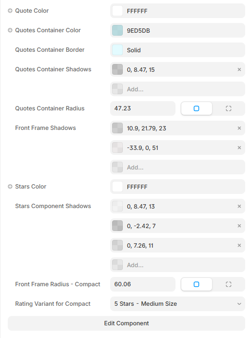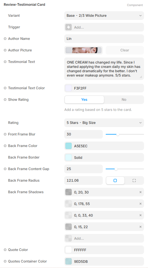 Additional properties let you fine-tune the testimonial text color, stars color, and front frame blur intensity — so whether you're going for glassmorphism, soft minimalism, or bold contrast, this card adapts effortlessly. (unlink the component to customize the font and other properties that can't be surfaced in Framer component properties and need a local style to be customizable from the outside).