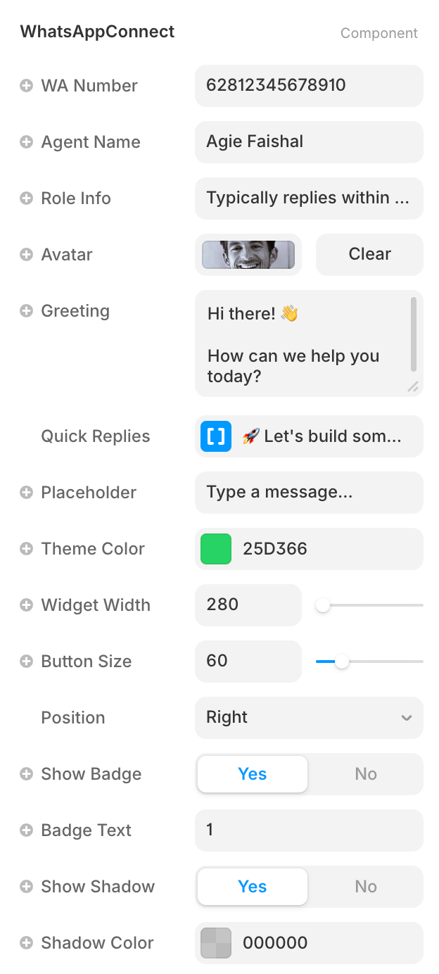 Add your WhatsApp number, and the component automatically cleans the format to prevent broken API links.