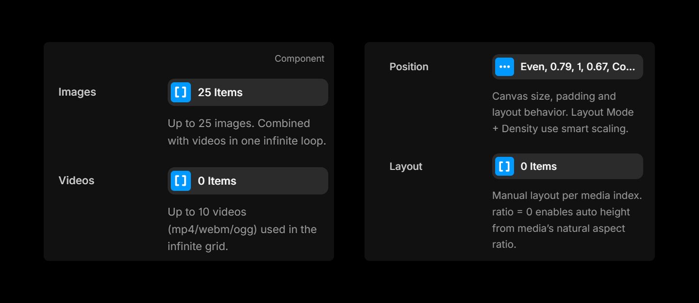 An optimized component with an infinite canvas effect that supports images and video media. You can control the layout automatically or manually. Animation control is available.